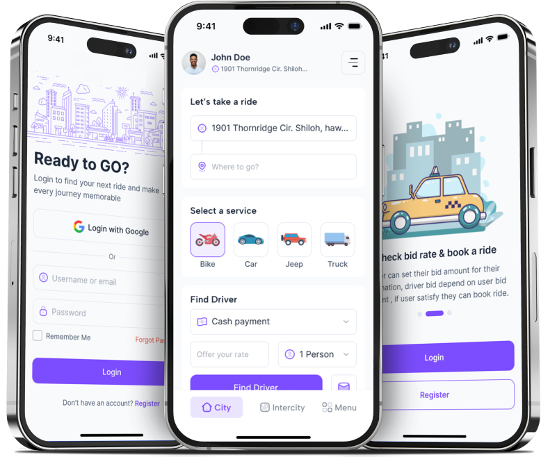 Riders enter their trip details, and drivers submit competitive bids. Riders can compare offers based on price and ratings.